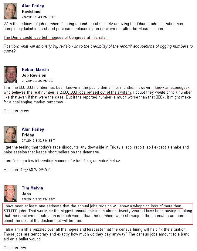 Das BLS nennt morgen die Revisionen für die AL-Zahlen in 2009. Sie wurde, so die Flüsterzahl, mit 800.000 Stellen zu hoch angesetzt, so dass eine Abwärtsrevision um 800.000 (für das gesamte Jahr) anstehen.