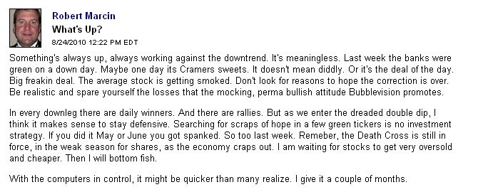 The market has not fully embraced and priced in the chances of a double dip, and that is why bad news is being treated as bad news. Once the market really accepts the idea that the economy is in trouble and expectations are lower, then we'll have a better chance of rallying on bad news.