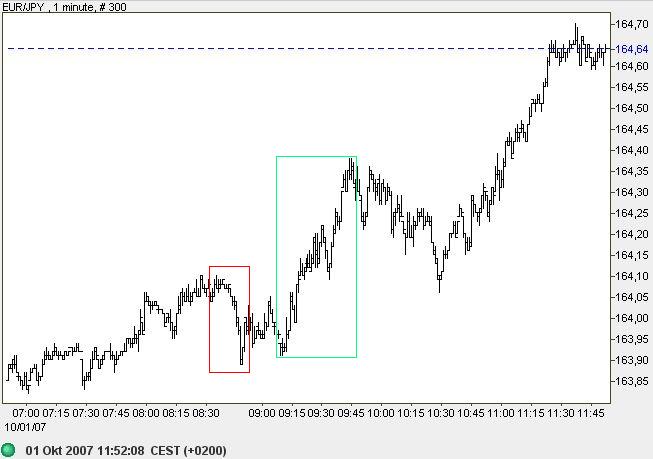 Hier stehen wir nun heute und in den kommenden Wochen: Steigende Kurse wegen sinkender Zinsen! Wann kippt das Spiel? Wenn die Unternehmensgewinne sinken und weiter zu sinken drohen (also aufgepasst auf die kommende Berichtssaison), weil das NIEMAND wegreden und ignorieren kann. Das ist real, das ist es worum es hinter dem Geldschleier geht, was auch das gemeine Volk (die realen Geldgeber) kapiert und, was deshalb von der Finanzmafia in Handlung umgesetzt werden muss: Raus aus den Aktien, Gewinne mitnehmen, weil den letzten beissen die Hunde. Dann endlich haben wir einen Bärenmarkt...:-)) Ich schätze mal im Laufe 2008.
