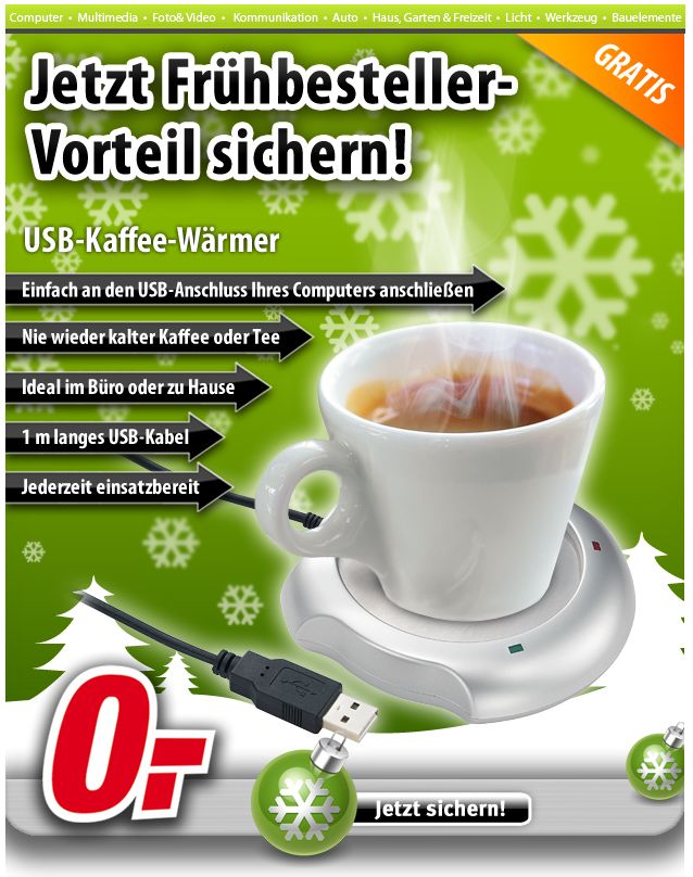 Das ist das Letzte: Bei Bestellungen bei einem Computer/Elektronik-Versender gibt es jetzt gratis einen Kaffeetassenwärmer mit USB-Anschluss.