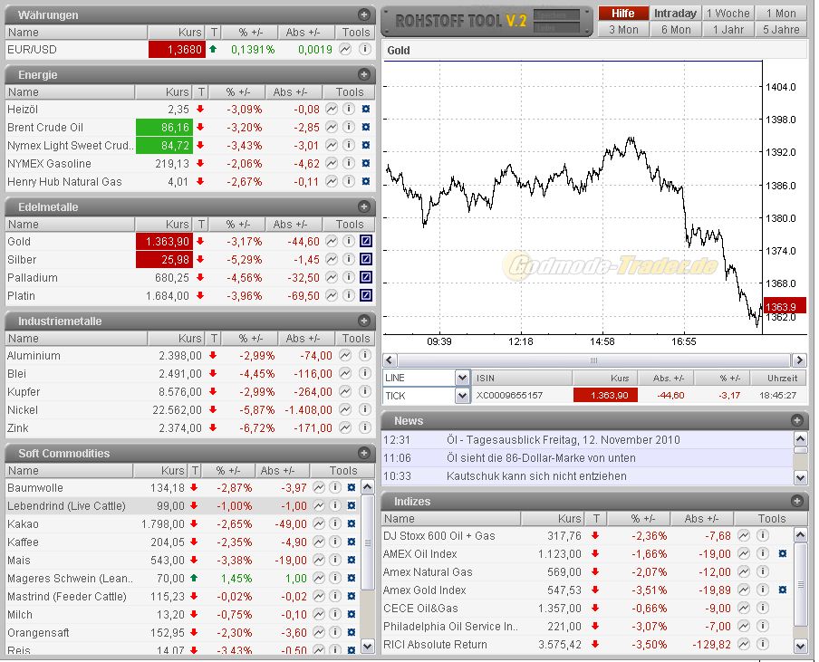 Im Gefolge der chin. Zinserhöhung fallen die Indizes weltweit, ebenso die Rohstoffe (siehe oben), während der Dollar stärker wird.