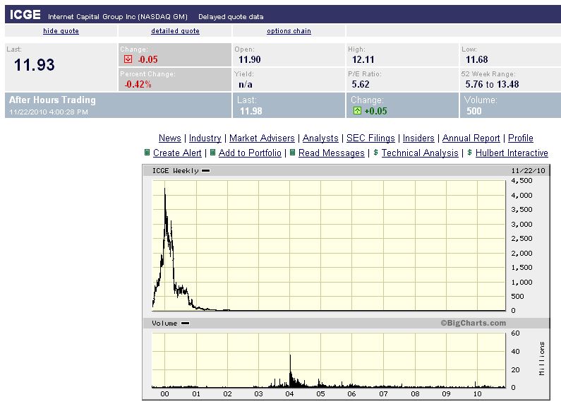 Es ist mMn eine Illusion zu glauben - wie der Spiegel-Redakteur es tut - dass die Hauspreise innerhalb der nächsten Jahre (Jahrzehnte) wieder das vormalige Blasen-Niveau erreichen, selbst wenn "die Konjunktur anzieht". Das ist ähnlich absurd wie anzunehmen, dass Aktien aus der Internetblase je wieder ihren Einstandskurs erreichen. Nehmen wir Libudas Lieblingsaktie Internet Capital Group (Chart unten). Die fiel von 4200 Dollar im Jahr 2000 auf nur 3 Dollar in 2003 und notiert inzwischen bei 11,90 Dollar. Sie wird NIE wieder auf 4200 Dollar steigen (außer bei Hyperinflation). Genausowenig haben holländische Tulpenzwiebeln, die in der Tulpenzwiebel-Blase im 17. Jrhd. zum Gegenwert eines Wohnhauses gekauft wurden, jemals wieder die damaligen Mondpreise erreicht: