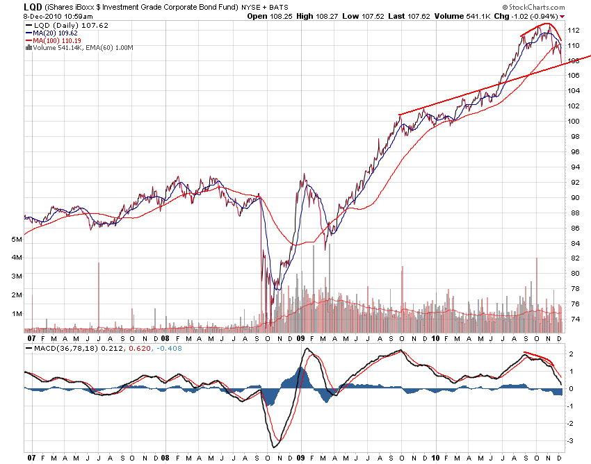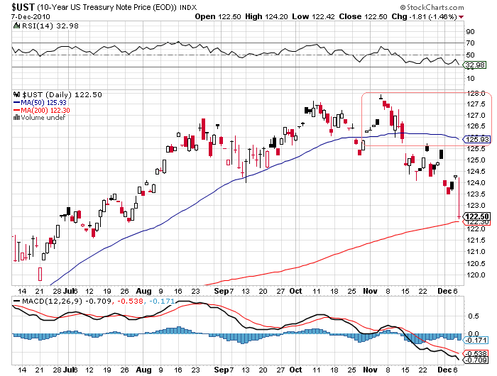 Bond yields continue on their rising trend with the yield on the U.S. 10-year T-note now at 3.2%. They were up nearly 20 basis points (bps) since that rotten payroll report last Friday and now up about 60bps since the FOMC meeting that ushered in QE2 – nice call by the Fed to try and bring long-term rates lower. (Did you know that the low in yields was turned in a full month before that meeting?) Good thing the central bank doesn’t have to mark-to-market its portfolio. Take note that the 10-year note has broken above the 200-day moving average (m.a.) of 3.07% and must find support at 3.25% or things may turn ugly over the near-term (and will only break once the equity market figures it out).