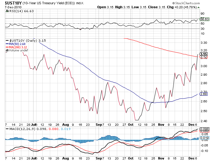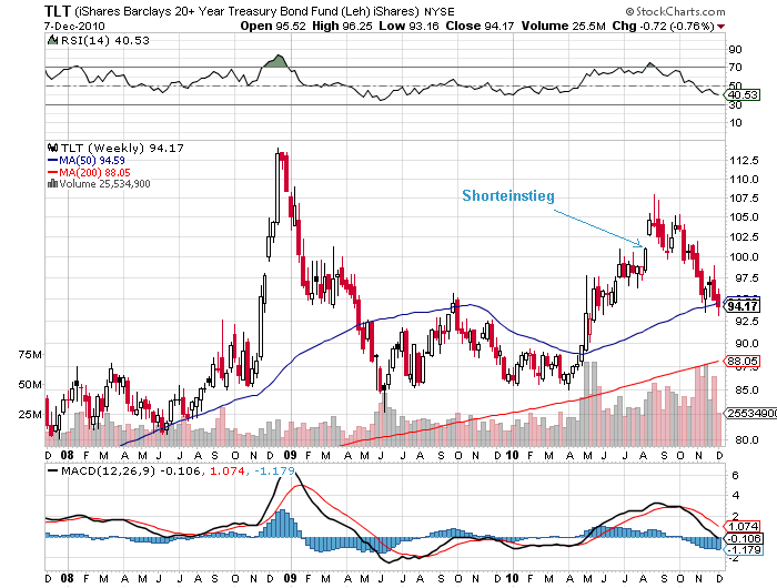 Seit der Ankündigung von QE2 schießen die Renditen für 10-jährige US-Staatsanleihen in die Höhe (Chart unten)