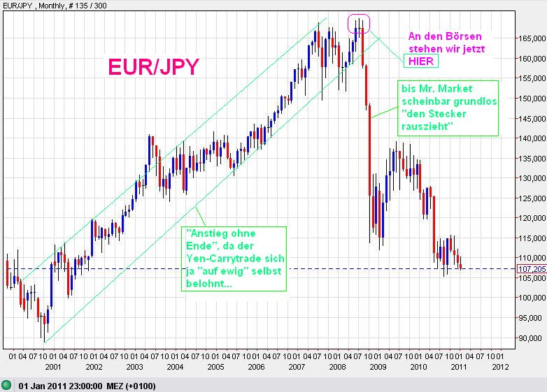 2008 jedoch hat Mr. Market völlig unerwartet "den Stecker rausgezogen". Seitdem geht es mit dem Yen gnadenlos bergauf (bzw. mit EUR/JPY bergab). Der Yen flirtet inzwischen - trotz japanischer Rekordverschuldung - mit neuen ATHs zum Dollar und Euro.
