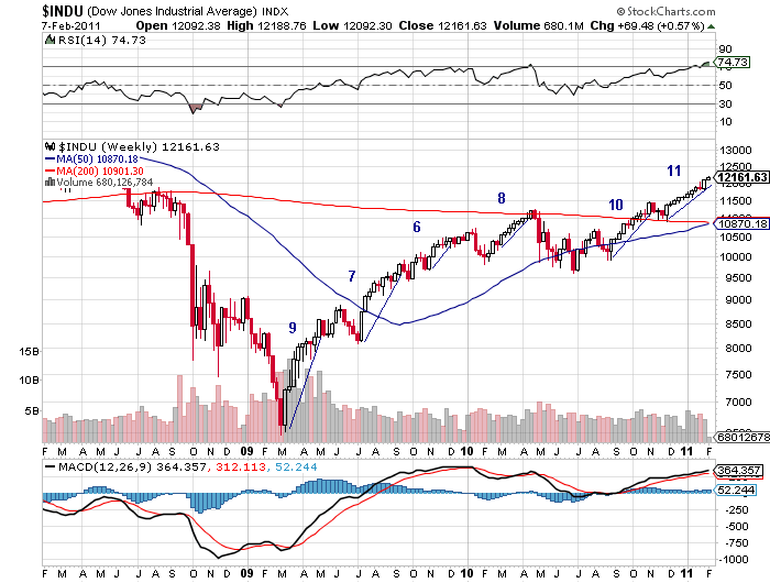 Die aktuelle Aufwärts-Welle ist mit 11 weißen Wochenkerzen (11. Woche läuft noch) die dynamischste seit März 2009. Das spricht für eine letzte Erschöpfungswelle nach oben (breite Bären-Kapitulation, Blow-Off-Top, C-Wellen-Ende) mit folgender Trendwende. Steht im Einklang mit dem tiefen VDAX in # 225.