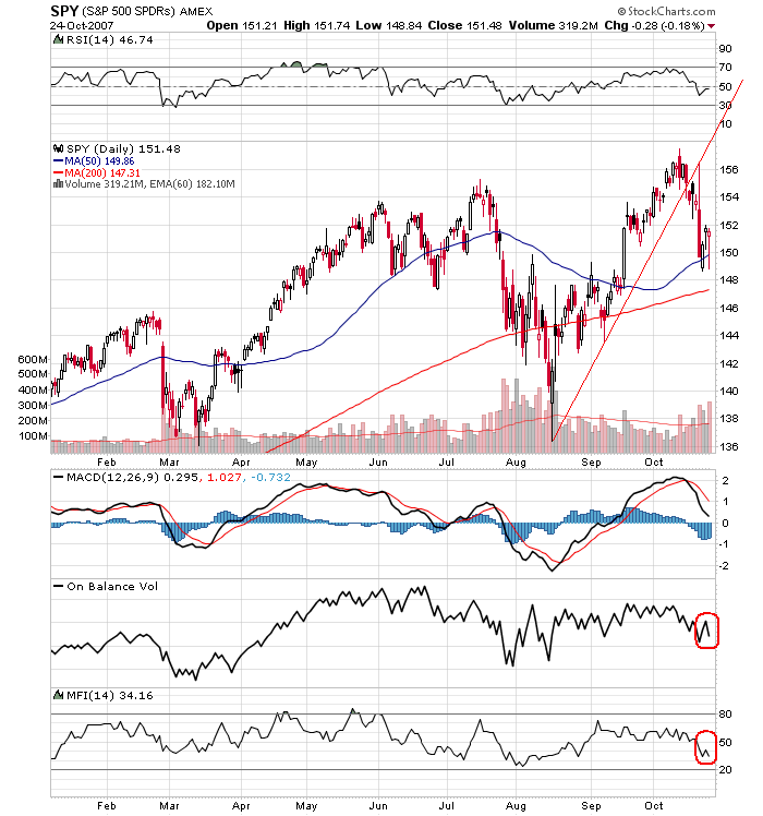 Today we had the slight midday bounce and are now starting to roll over again, but have yet to take out the morning lows. The morning lows are the key technical point, where many sell-stops are probably set. Watch for a selling spike should we hit that area, which is about 2720 for the Nasdaq and 13,470 for the DJIA. I will consider pressing short positions should those levels, or other similar levels in other indices, be breached.