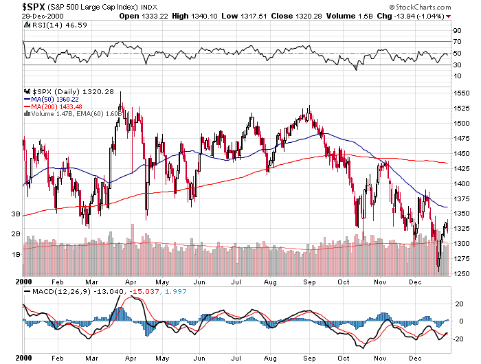 Der Wilshire Index wird gleichzeitig hilfreich in Dollar ausgezeichnet. So kann man sofort sehen, wie viel die Leute verlieren. Zwischen Erreichen des höchsten Wertes von ungefähr 15.900 und der vergangenen Woche – als der Index auf 14.600 zurückfiel – entstand ein Verlust von ungefähr 1,3 Billionen Dollar.