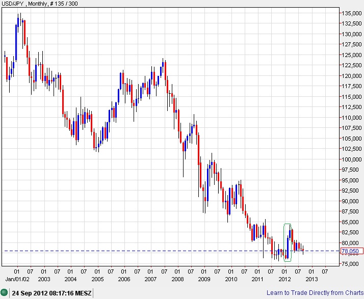 Im zweiten Halbjahr 2011 pendelte USD/JPY in der Nähe des Allzeit-Tiefs von knapp über 75.