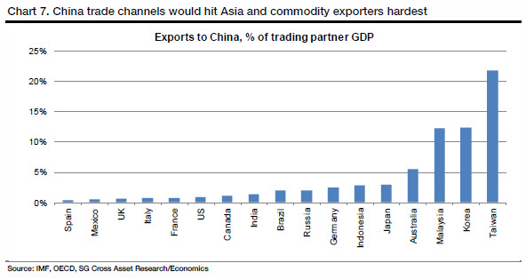 Following on from our earlier discussion of how a Chinese hard landing would evolve, SocGen now examines how a Chinese hard landing would impact the global economy. They see the contagion in several ways: mechanically (since China is part of the global economy) and through trade, financial and market channels. Mechanically, a slump in Chinese GDP growth to just 3% would cut our global GDP growth forecast by 0.6pp. Add to that the channels of transmission to the global economy, and our expectation is that a Chinese hard landing would result in 1.5pp being slashed from global GDP growth in the first year.