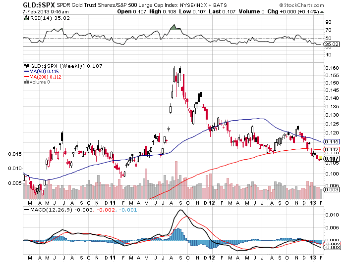 Das kann in grober Näherung erfolgen, indem man den SP-500 relativ zum Goldpreis aufträgt.