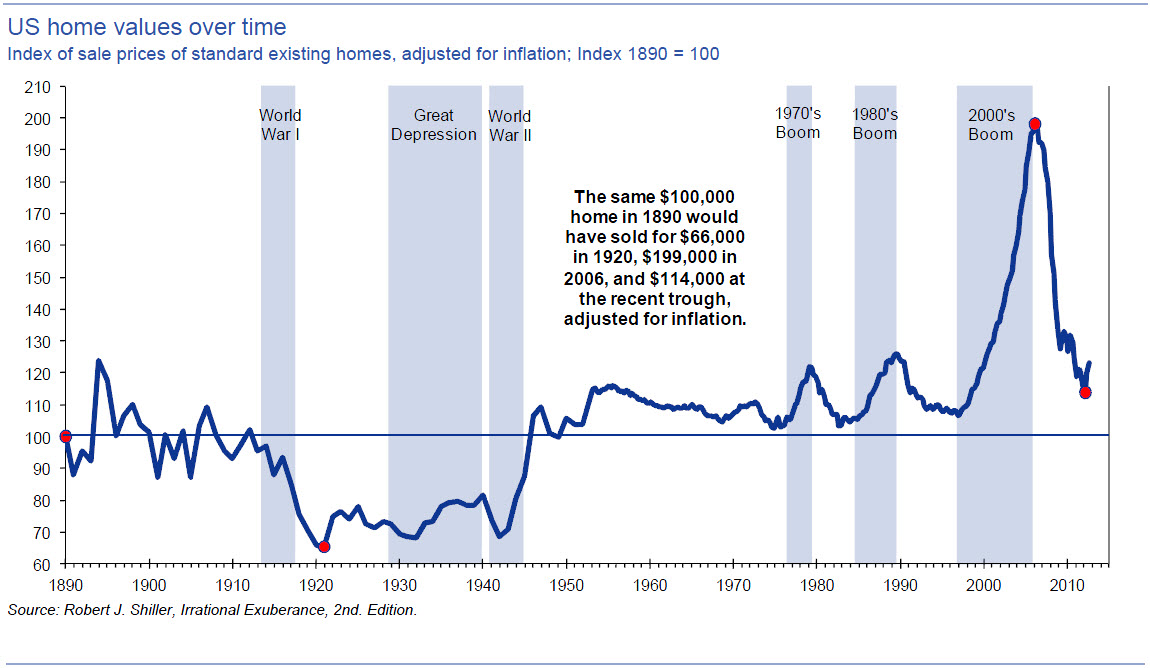 Die "sagenhaften" Gewinne, die man in der Vergangenheit mit Immobilien angeblich erzielen konnte, sind nichts anderes als die Kehrseite der Inflation. Wer 1890 in USA ein Haus gekauft hat, der hat nach aktuellem Stand inflationsbereinigt gerade mal 14 % realen Wertzuwachs erzielt (Chart unten).