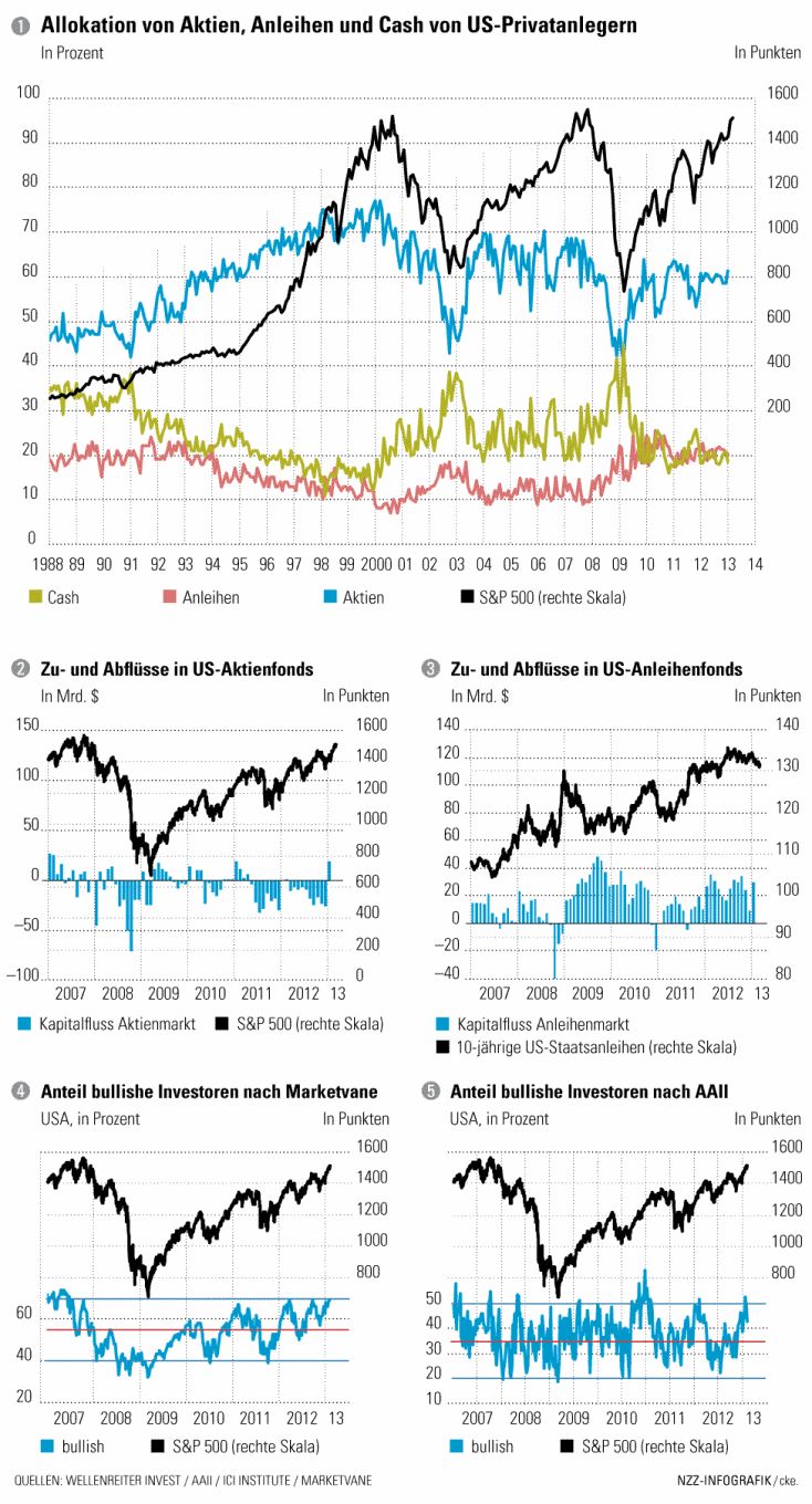 Von einer drohenden Korrektur aufgrund überbordender Stimmung berichtet aktuell die NZZ und illustriert diese Aussage mit Charts von Marketvane und AAII über den Anteil bullisher US-Investoren und Fondsmanager , welche in der Tat momentan sehr optimistisch gestimmt erscheinen. Der Cash-Anteil der privaten US-Investoren bewegt sich aktuell in Richtung eines 10-Jahre-Tiefs, von dieser Seite her dürfte also eher kaum Treibstoff für kommende Kurssteigerungen an den Börsen zu erwarten sein, da die Teilnehmer weitestgehend investiert sein dürften. Wie bereits hier im Thread bereits auch schon thematisiert, erscheint es ebenfalls sehr wohl möglich, dass es statt einer von den Aktien-Bullen erwarteten grossen Rotation von Anleihen in Aktien doch hier sogar eher zu einer grossen Enttäuschung kommen könnte. Zwar flossen in der Tat gewisse Gelder aus Anleihen hinein in den Aktienmarkt. Doch die grössten, in Aktien investierten Summen stammten aus dem Cash-Segment. Massivere Anzeichen für eine Umschichtung der Gelder vom Anleihenmarkt in Aktien gibt es hier also definitiv nicht, der Anleihenanteil in der Allokation sank zuletzt nur marginal von 20,8% auf 20,2%, so die NZZ.