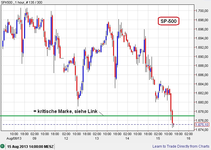 Der SP-500 gibt sich heute recht bärenfreundlich. Für den "großen Rutsch" müsste er unter 1677 schließen. Das sollte dann morgen einen schnelle Fort-"Fall" auf 1653 zur Folge haben. Darunter winken 1600 und 1560 - wobei 1560 wohl kurzfristig das tiefste wäre, worauf die finstere Bären-Seele (im ersten Anlauf) hoffen dürfte.