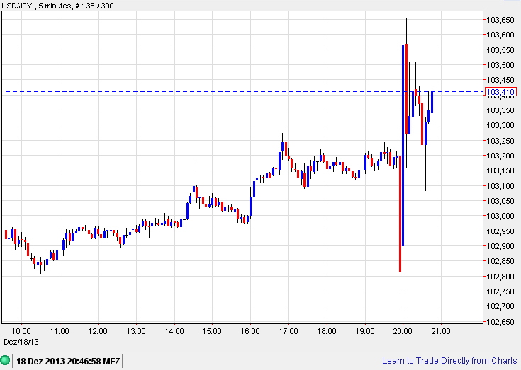 Die Fed kündigte gestern an, ihren Overnight-Zinssatz noch „weit über den Zeitpunkt hinaus, an dem die Arbeitslosenrate unter 6,5 Prozent sinkt", nahe null halten zu wollen.