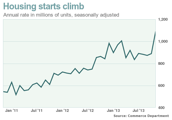 Housing starts leaped 22.7% in November to reach a seasonally adjusted annual rate of 1.09 million, with surges for single-family homes and apartments, according to the U.S. Department of Commerce. Economists polled by MarketWatch had expected overall housing starts in November to hit a rate of 963,000.