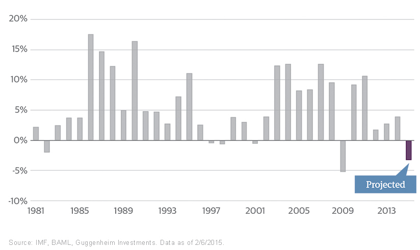 As economic growth returns again to Europe and Japan, the prospect of a synchronous global expansion is taking hold. Or, then again, maybe not. In a recent research piece published by Bank of America Merrill Lynch, global economic growth, as measured in nominal U.S. dollars, is projected to decline in 2015 for the first time since 2009, the height of the financial crisis.