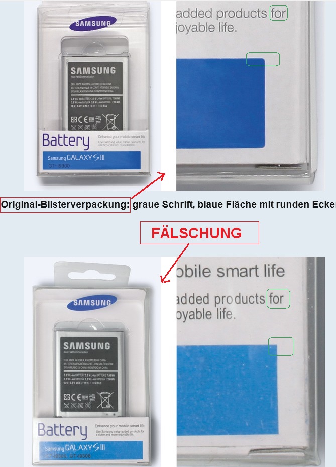 Von 12 Samsung-Akkus, die die Zeitschrift C't (Artikel unten) testweise bei Amazon kaufte (vier bei Amazon selbst, acht bei Drittanbietern, die bei "Amazon-Marketplace" verkaufen), waren ALLE gefälscht. Dies stellte sich heraus, als C't die gekauften Akkus an Samsung Deutschland zu Überprüfung schickte.