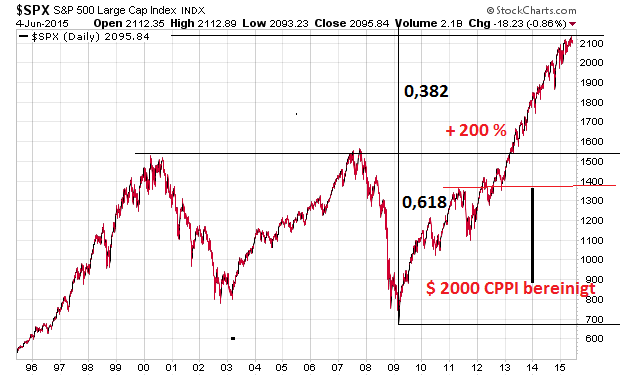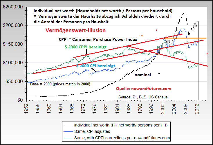 Das massive Gelddrucken führt automatisch zur Preisstützung / Preisanhebung bei Spekulationsgütern: Asset-Inflation. Der Dow interessiert da weniger, wohl aber die Hauspreise, die inzwischen bei ca. 20 Jahresgehältern (netto) liegen - in Regionen, die als Ballungsräume gelten und entsprechend Arbeitsplätze bieten. Und damit einen Großteil der Kaufkraft (der arbeitenden Klasse, des "Mittelstands") absorbieren. Zugunsten der Banken führen die Zentralbanken gezielt eine Beschädigung des Marktes durch (Japan ist das große Beispiel einer Banken-induzierten Langzeitrezession)