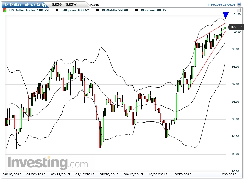 wird der Dollar. Natürlich wird es einen Leitzins von 0,25% geben - aber zusammen mit einem fetten QE welches mit denen von Draghi und Abe konkurrieren kann - was sonst? Das nächste Anditschen am BB oben und der deckelden Linie des lfd. EDT wird den Dollar nach unten schicken - vor dem nächsten FOMC-Gesülze, denn die marktrelevanten Bankster werden vorher informiert.