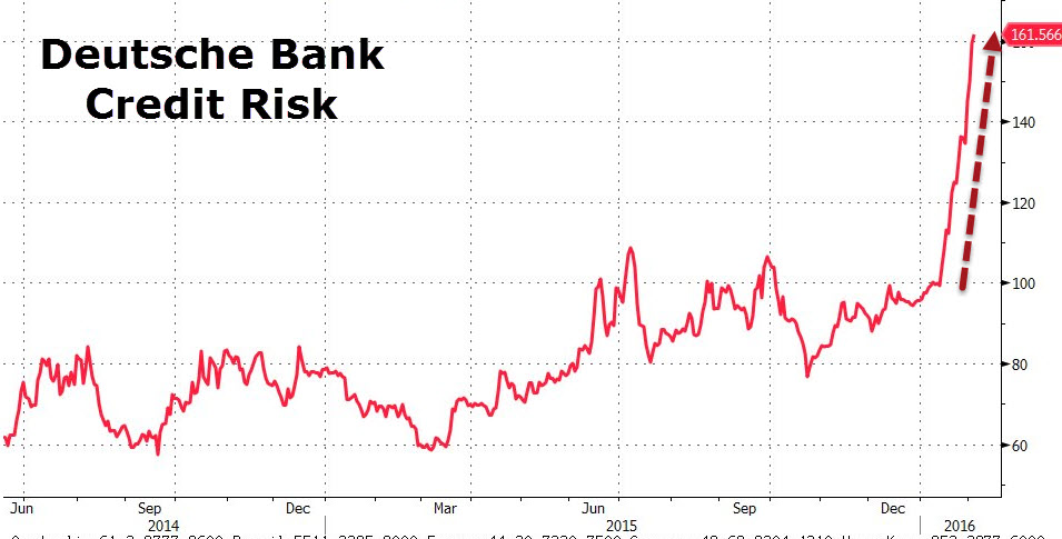 Das Handelsblatt berichtet im Zuge der von der Deutschen Bank gemeldeten Rekordverluste aktuell, dass sich die Risiken des Instituts mittlerweile auch massiv am Anleihemarkt niederschlagen. Am Markt für Credit Default Swaps (CDS), mit denen sich die Investoren gegen den Ausfall von Anleihen absichern können, haben die Risikoprämien für das Frankfurter Geldhaus stark angezogen, so das HB. Der ZeroHedge-Blog liefert gar einen beeindruckenden Chart hierzu.