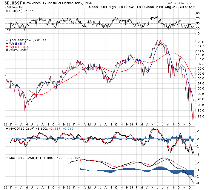 The successive moves by the Treasury and the Fed to restore confidence look increasingly panicky and desperate as they attempt to deal with the first credit crisis of the derivatives era. We have now witnessed three cuts in the fed funds and discount rates, extensive open market operations, an attempt to shore up the SIVs and a plan to freeze subprime mortgage rate resets. The latest action is a coordinated plan (the term auction facility) to induce banks to lend more readily to one another and overcome the atmosphere of fear that has upset the world’s credit markets since August. While the latest plan may help liquidity a bit it doesn’t get to the heart of the problem—insolvency, debt deleveraging, asset writeoffs, the continuing lack of transparency and the ongoing decline of the housing market. In addition the forces for recession have already been set in motion and are not likely to be stopped at this late date.