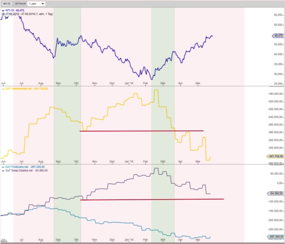 Wenn man denn will, kann man sich den Disaggregated Commitments of Traders Report ansehen; dort sind die Swap-Leute aus der Comm-Gruppe rausgenommen. Also nur noch die Producer/Merchant/Processor/User…