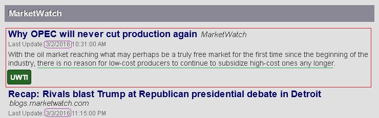 Seit 2. März 2016 - d.h. seit fast vier Monaten! - listet Bigcharts (= CBS Marketwatch) die unten gezeigte, offenbar als Bären-Köder lancierte "News" stets unverrückbar an erste Stelle. Denn Öl-Bären arbeiten den Goldman-Schacherern in die Hände. Niemand kauft zuverlässiger als ein gesqueezter gehebelter Bär.