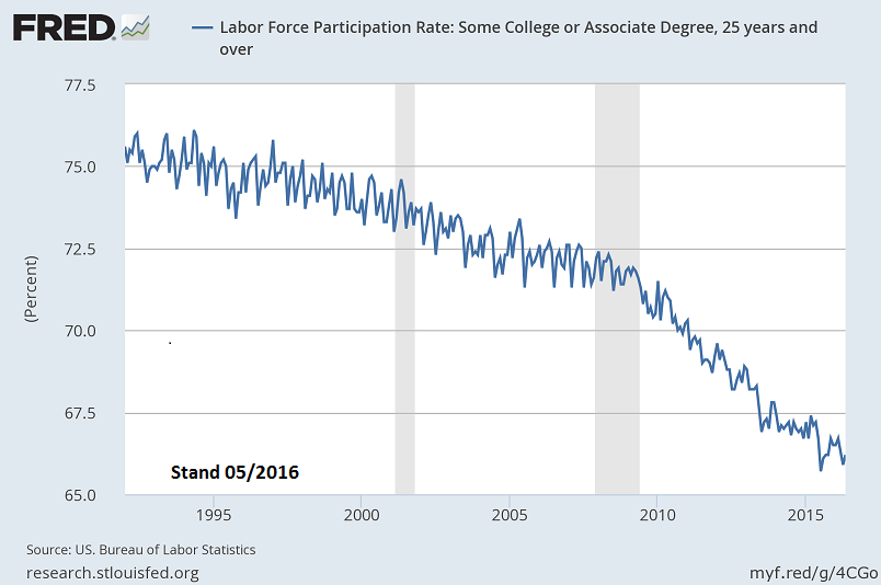 Unter allen Gruppen der Labor Force Participation Rate findet diese Gruppe die relativ wenigsten Jobs. Selbst Bachelor und Master Abschlüsse an Universitäten sind - wie auch hierzulande -absolut keine Jobgarantien.
