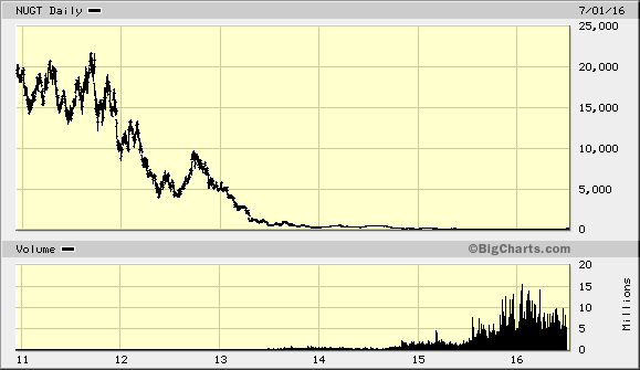 (Mehrfach)-Hebelprodukte wie NUGT haben in der Regel eine erhebliche Churn-Rate (Geldverbrennungs-Rate). Das gilt besonders für gehebelte Short-ETF wie z. B. iShares SDS (auf SP-500), QID (auf Nasdaq) oder TWM (auf Russell 2000).