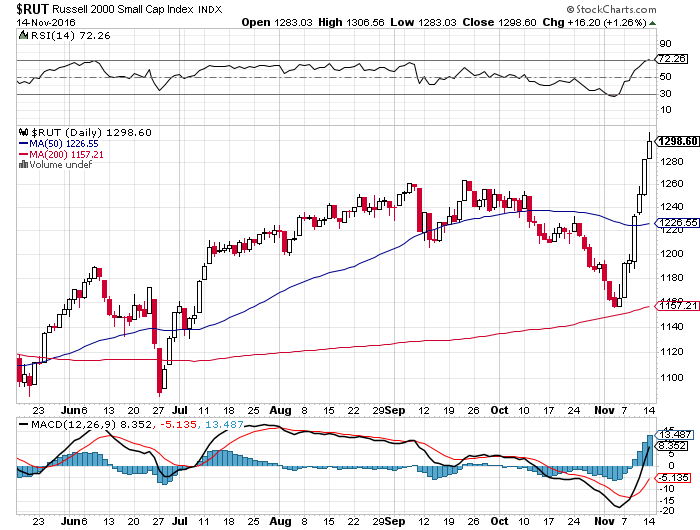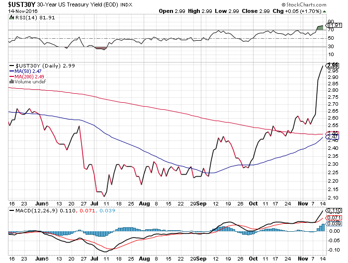 Indeed, bond prices have collapsed in recent days, sending bond yields for the 10-year Treasury note shooting some 40 basis points higher since Trump gobsmacked investors by defeating Democratic opponent Hillary Clinton. Those moves have come as the Dow Jones Industrial Average has been registering records, finishing at another all-time closing high Monday and marking its sixth straight finish in positive territory.