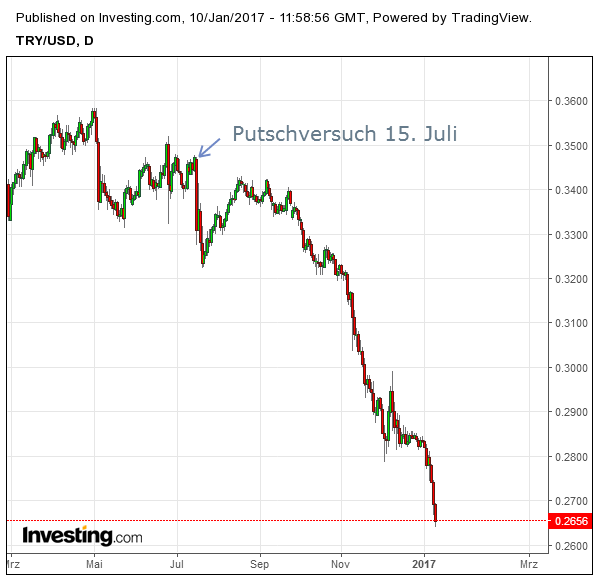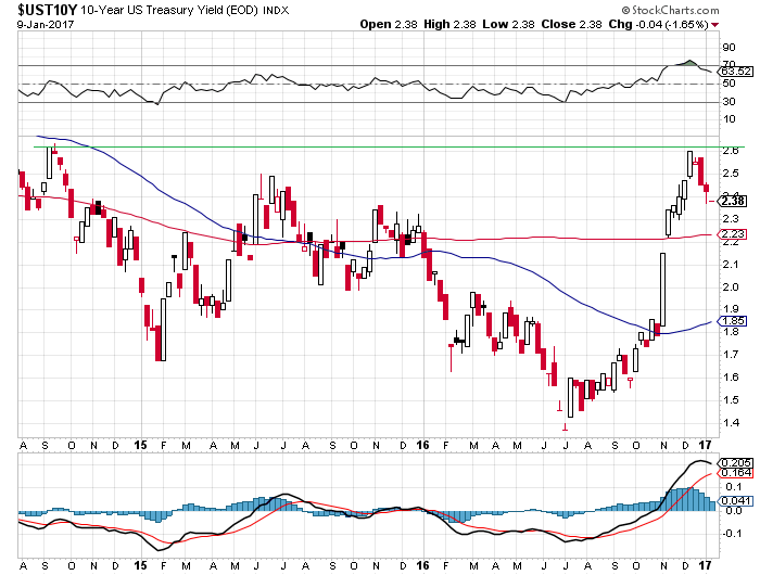 If 2.60% is broken on the upside – if yields move higher than 2.60% – a secular bear bond market has begun. Watch the 2.6% level. Much more important than Dow 20,000. Much more important than $60-a-barrel oil. Much more important that the Dollar/Euro parity at 1.00. It is the key to interest rate levels and perhaps stock price levels in 2017.