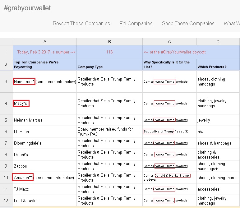 Neben Nordstrom (letztes Posting) zählen zu den wegen Trump-Angeboten boykottierten Firmen Macy's (größte US-Warenhauskette mit 800 Filialen) und Amazon.