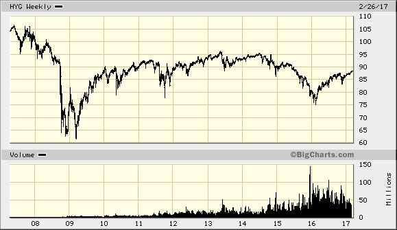 Der Chart des Junkbond-ETF "HYG" (unten über 10 Jahre) hat ab 2015 - - nach langjährigen Höhenflug ab den 2009-Tiefs - wieder zu schwächeln begonnen. Dies könnte mit der oben von mir geschilderten Problematik in Zusammenhang stehen.