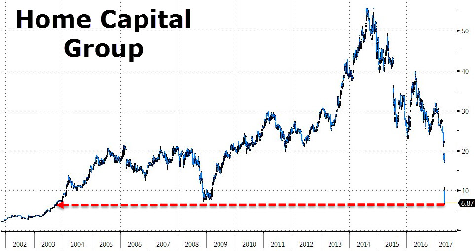 Der Kurs des größten kanadischen Hypotheken-Verleihers "Home Capital Group" ist heute brutal abgestürzt (Chart unten). Im Jahr 2014 markierte die Aktie ihr ATH bei knapp 60 Dollar. Heute fiel der Kurs erdrutschartig auf 6,87 - das Kursniveau von 2003. Anfang 2017 stand die Aktie noch bei 30.