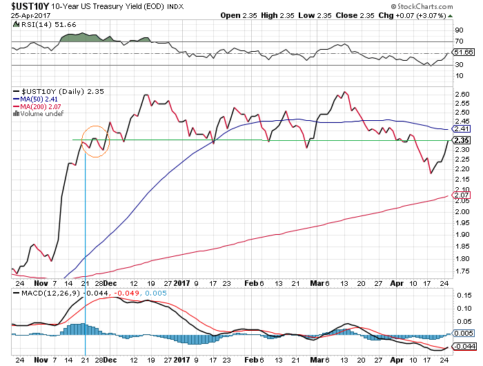 A.L.: Maßgeblich für die Märkte (Kreditaufnahme, Hypothekenzinsen) sind die Renditen der US-Langläufer. Unten der Rendite-Chart der US-10-jährigen. Wie man sieht, stand deren Rendite vor einem halben Jahr bei 2,35 % - GENAU WIE HEUTE. Lediglich die Leitzinsen sind durch die Zinserhöhungen der Fed gestiegen, mit aktuell 0,75 % gemessen an der US-Inflation von 2,2 % (offiziell, inoffiziell deutlich höher) aber immer noch viel zu niedrig.