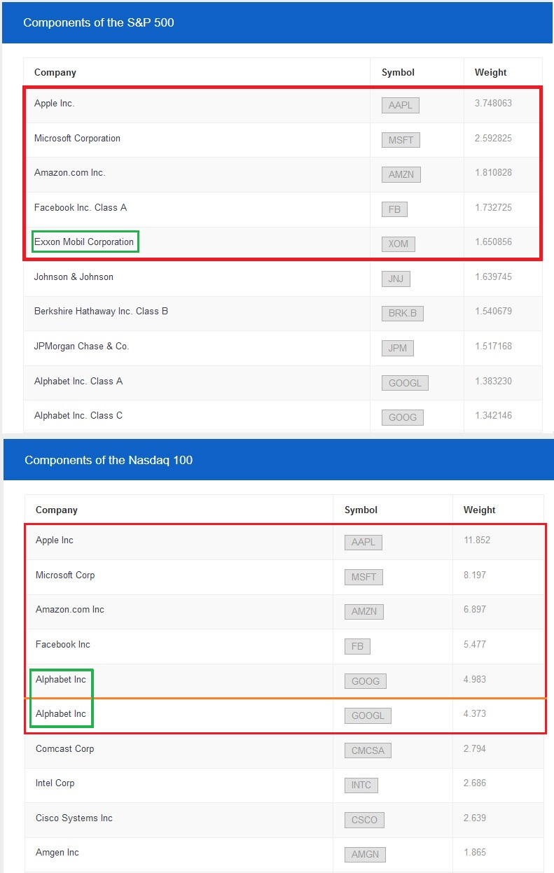 Unterschiedlich ist nur Platz 5. Im SP-500 ist das Exxon, im Nasdaq-100 (NDX) ist es Google (Alphabet). Alphabet sind zwei Aktien, so dass ein Vergleich der ersten 6 Plätze treffender gewesen wäre.
