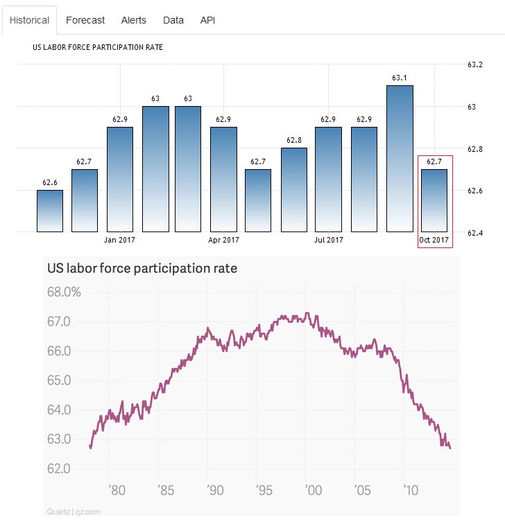 Die pro forma niedrige Arbeitslosenquote von aktuell 4,1 % (30-Jahres-Tief) kommt vor allem dadurch zustande, dass viele Amerikaner statt eines gutbezahlten Fulltime-Jobs nur noch mehrere schlecht bezahlte Nebenjobs (z. B. einen morgens, einen mittags, einen abends) haben. Das wird von den Arbeitsmarkt-Statistikern wie drei (Fulltime-)Jobs von drei Personen gezählt, obwohl tatsächlich nur eine Person drei (Neben)-Jobs hat.