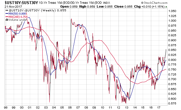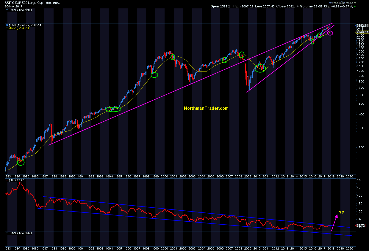 Anmerkung: Auch im Langzeit-Chart in # 667 ist unten die 10-jährigen-Rendite eingetragen ($TXN). Der Chart-Zeichner rechnet offenbar mit einem Ausbruch dieser Rendite nach oben (siehe Pfeil). Aktuell rentieren 10j.-UST mit 2,32 %. Seit Trumps Präsidentschaft ist $TXN jedoch deutlich gestiegen - von zuvor 1,45 % im Juli-Tief 2016.
