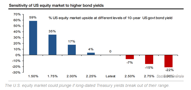 Ein Anstieg der Rendite 10-jähriger US-Staatsanleihen auf über 2,75 % soll laut SocGen eine Aktienmarkt-Korrektur in Höhe von 15 % auslösen. Bei einem Anstieg auf 3 % soll sogar ein Aktien-Minus von 22 % drohen (Chart unten).
