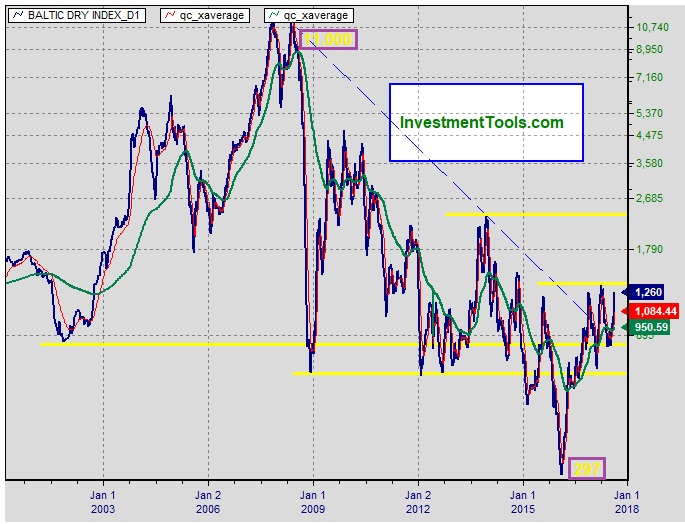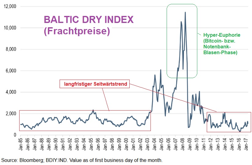Man muss sich als Bär ernsthaft Fragen, ob die Rallye in USA seit 2009 nicht ebenfalls kommende bzw. erwartete Inflation vorwegnimmt. Trump gießt mit 1,5 Billionen neuer Staatsverschuldung (Steuer-Erleichterungen für Ultrareiche) gerade frisches Öl ins Feuer.
