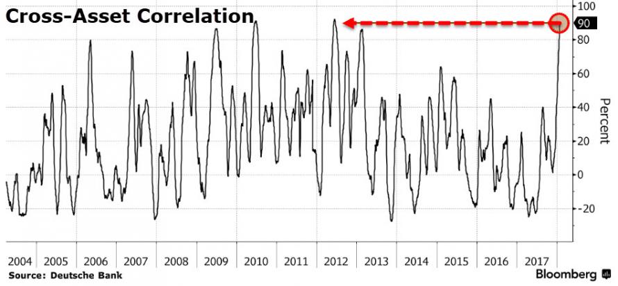 With positioning at extremes, and leverage at extremes, and valuations at extremes, Deutsche Bank's Binky Chadha raises the red flag as the correlation across asset-classes soars to record highs signaling extreme contagion risk.