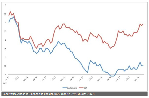 Das liegt an den erwarteten Renditen. Diese sind in den USA höher als in Europa. Und der Unterschied nimmt zu: Die langfristigen Zinsen in den USA entfernen sich immer weiter von den europäischen (siehe Abbildung 1). Im April 2018 erreicht der Unterschied zwischen Deutschland und den USA 2,4 Prozent. Zuletzt erreichte der Zinsunterschied 1989 diesen Wert....