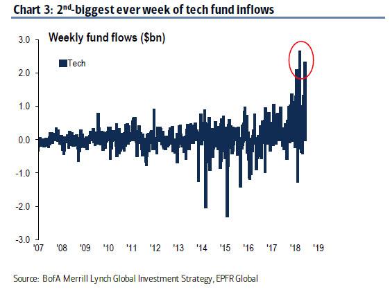 Hartnett followed up this this week by noting that while so far Tech stocks have seen record inflows as they have emerged as the "defensive growth" sector of the late market cycle, the "big risk" is "as in 1998, that credit tremors spread and investors forced to deleverage from risk assets, raise cash", while the "biggest risk" is a "quick, deep tech selloff. Or, as Bloomberg's Andrew Cinko put it on Friday it, "if the times get tough and investors must delever they will sell "what they own," and that "those who are rotating to financials and banks this week and away from tech may simply be trading the frying pan for the fire."...
