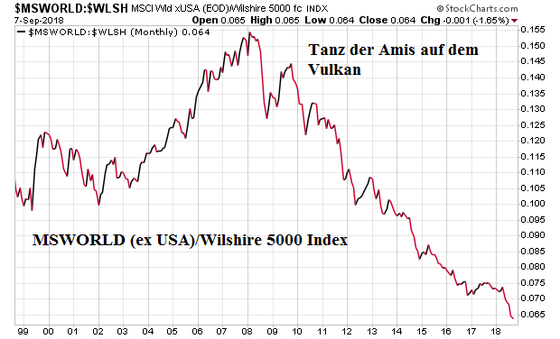 Dieser Chart zeigt wohl besser als alles Andere, in welch einem irrationalen Überschwang die US Börsen seit 2009 agieren. Dieser Überschwang ist in doppelter Hinsicht "geborgt": 1. durch billige Kredite und 2. durch eine ausgeuferte Staatsverschuldung, die nur noch im 2. Weltkrieg übertroffen wurde, und die immer wieder neue Dopes für die Wirtschaft ermöglichte. Doch aktuell herrscht weder Krieg, noch geht es der US Wirtschaft schlecht. Dies ist Keynesianismus auf die Spitze getrieben - keineswegs das, was Keynes gepredigt hat.