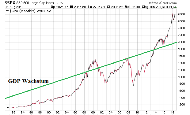 (Quelle: siblisresearch.com/data/total-market-cap-sp-500/). Das US GDP betrug in 1980 rund 4 Bio USD, und aktuell liegt es bei rund 20 Bio. USD (Wachstum seit 1980: 400 %). Ende der 1990er/Anfang 2000 wurde die GDP-Kurve erstmals von SPX-Kurve überschritten, doch seit 2014 hebt letztere sukzessiv weiter ab.