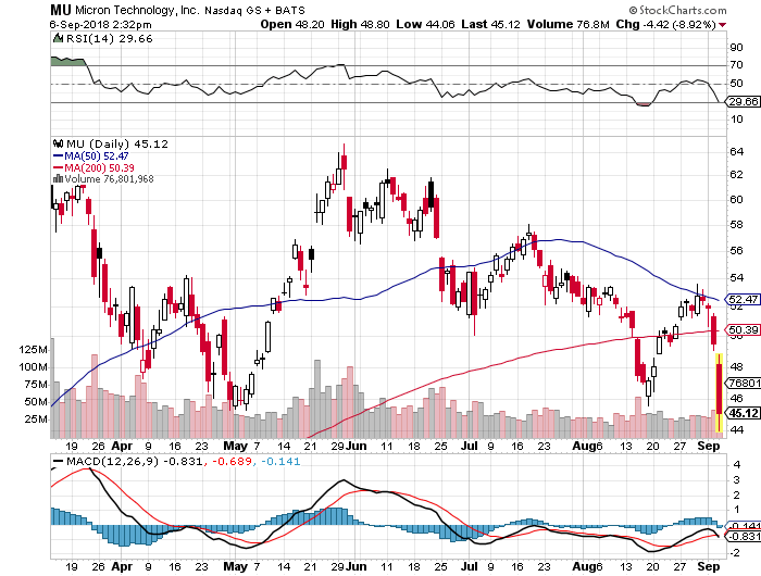 Falling the hardest were chip-making equipment companies, after KLA-Tencor Corp. KLAC, -10.01% at a Citigroup conference forecast that a rebound in chip shipments for the second half of 2018 would likely not be as strong as expected as recently as six weeks ago. KLA-Tencor shares dropped 9.5% to $107.51 in recent trading, while shares of Lam Research Corp. LRCX, -6.67% dropped 6.5% to $160.85 and Applied Materials Inc. AMAT, -5.00% shares fell 4.2% to $40.71.