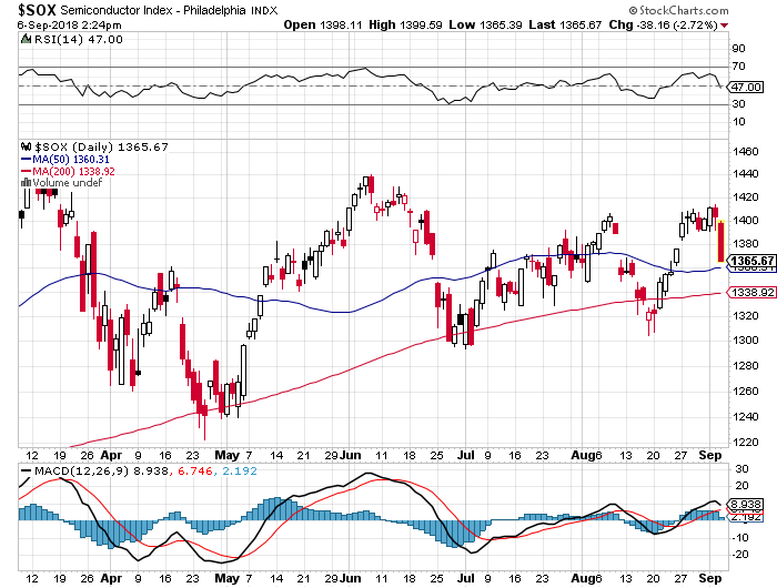 The PHLX Semiconductor Index SOX, -2.57% fell 2.6% Thursday on track for its worst one-day percentage drop since mid-July, compared with a 0.7% decline on the S&P 500 index SPX, -0.48% and a 1.3% drop on the Nasdaq Composite Index COMP, -1.09%