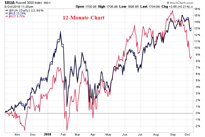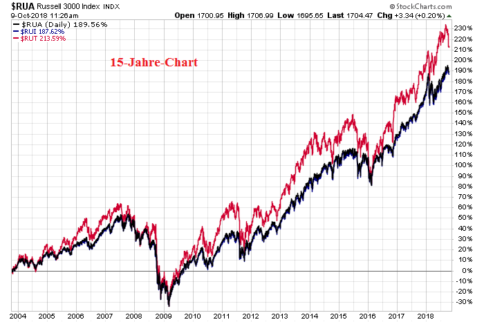Russell 3000 ($RUA) mit höchst kapitalisierten bis sehr niedrig kapitalisierten Werten - Russell 1000 ($RUI) mit den 1000 am höchsten kapitalisierten Werten des Russell 3000 - Russell 2000 ($RUT) mit den 2000 am niedrigsten kapitalisierten Werten des Russell 3000. Der Nasdaq Composite Index enthält rund 2500 Werte, die sämtlich auch im Russell 3000 enthalten sind. Dazu kommen dann noch rund 500 Werte aus dem NYSE Composite Index. Den Vergleichschart der Russell Indizes finde ich sehr aufschlussreich: Zwischen den Entwicklungen des Russell 3000 und denen des Russell 1000 besteht kaum ein Unterschied, da die hochkapitalisierten Werte des letzteren den Russell 3000 krass dominieren.