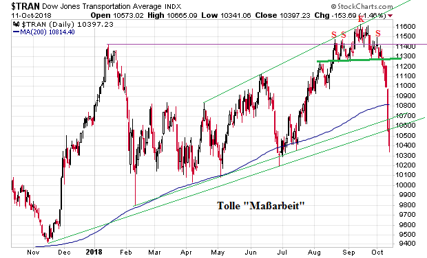 Im Chart sind zwei Abwärtspfeile eingetragen, gleicher Länge, die die maximale Bewegung vom letzten Jahreshoch zum Tief letzte Woche wiedergeben. Die hellblaue Linie ist der maximale Kurs, der erreicht wurde, nachdem dieses Tief feststand. Von diesem Verlaufshoch wird dann die Strecke nach unten abgetragen, deswegen ist der zweite Pfeil dort angesetzt. Es ergibt sich:
